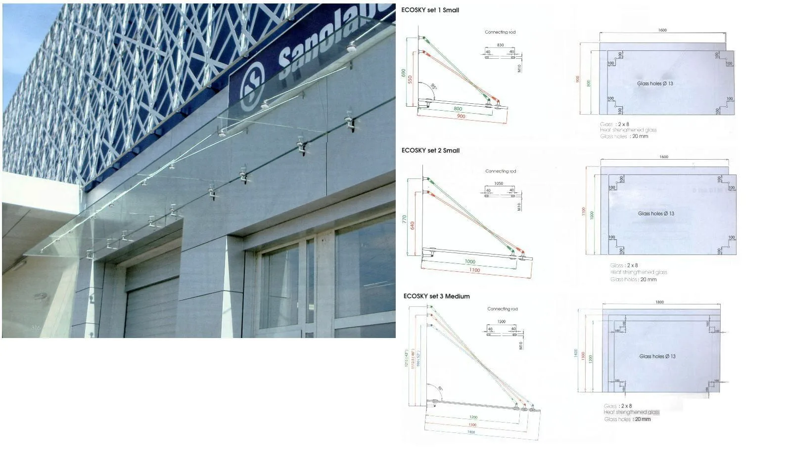 The canopies metalglas are available in different sizes & overhangs, With the continuously adjustable connecting rods the canopy can be aligned accurately +/- 20mm in mounted condition. The slope of the roof can be adjusted +/- 5 degrees by revolving rod.