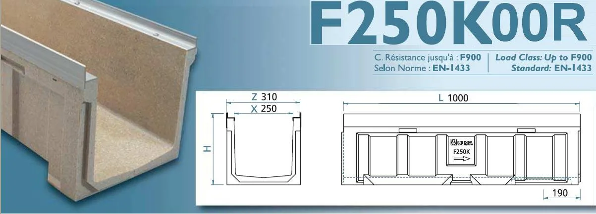 Ulma Linear Dranage Channel type F250K00R:External width 310mm; Internal Width 250mm; Available with overall heights between 300mm – 400mm. Suitable for cascaded type slope to collect rain water in 1 meterlong units. Locking system consists of 8 bolts