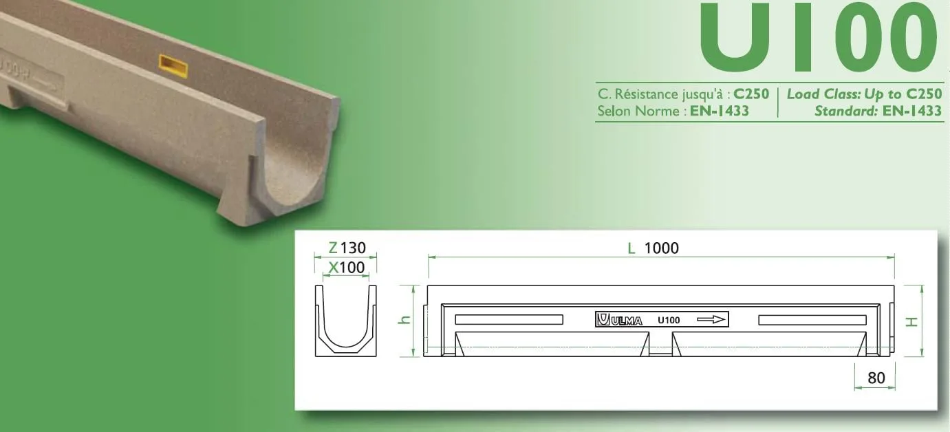 Ulma Linear Drainage Channel type U100:External width 130mm; Internal Width 100mm; Available woth overall heights between 130mm and 230mm, 0.5% pre-slopped channels to collect rain water in 1 meter long units. Consists of locking bar CS100 + screws.